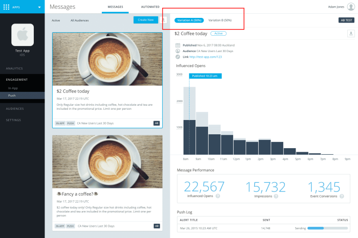 When an AB test message is published it will appear in the messages stream with a small AB icon on the message card. You can switch between each linked variation in the top right hand panel to see which one was the most successful. To compare messages you can check the opens, impressions and event conversions between message variations as per a regular message.![]()