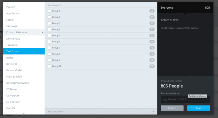 - Use the audience builder to create an audience with Test Group "Group 1" selected. There are 10 test groups, so selecting one will select 10% of your users. You can choose to further restrict the audience using other criteria, like language or locale.
