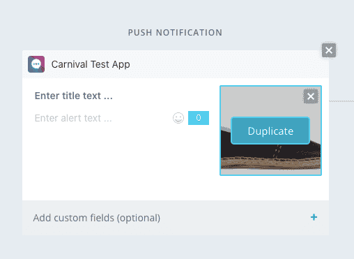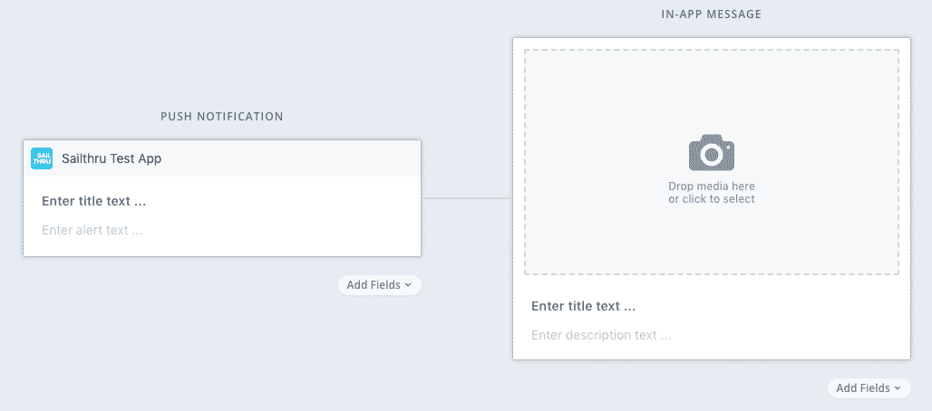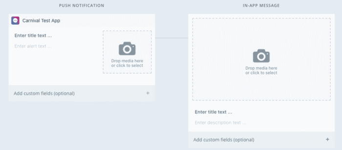 The push notification and the in app message appear linked when you create a new message. When you add a media file to either message, it will appear with an overlay button allowing you to duplicate the image to the other.