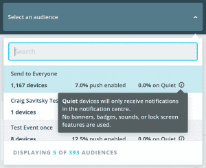 When creating a message, you will choose users to target based on audience segments that you have previously defined. Audiences can be created in the Audiences section. The first thing to do is select your target audience from the Select an audience menu on the top bar. When you open the menu, you'll see that each audience shows the number of users, how many are push enabled, and how many of the enabled users are set to Quiet.
