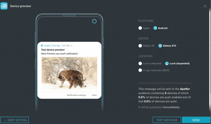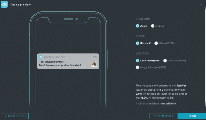- From the Device preview screen, you can go back to continue editing, send a test message, or send your message immediately.