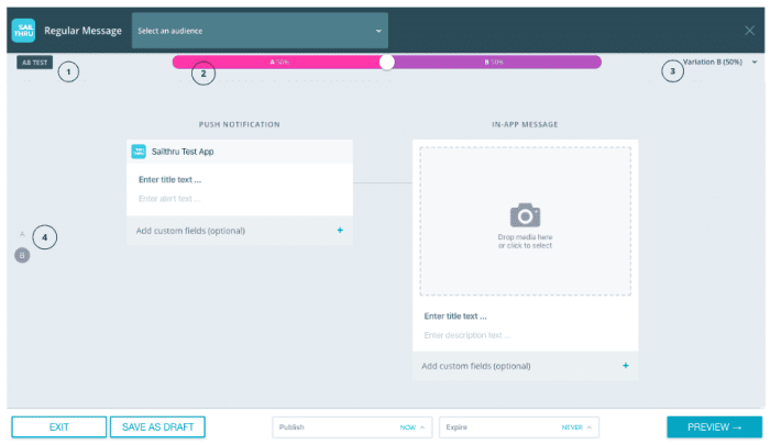 To maximize the response to your messages, you can create and test multiple variations of your push notification or in-app message content for any Regular (Non-Automated) Message.