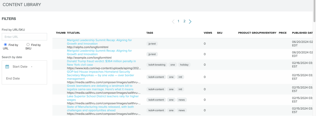 To see the data that is being collected on your website, click to the Content page in My Sailthru. You will see content listed under the following headers. See Personalization Engine Meta Tags for examples of how to set up these tags on your site.