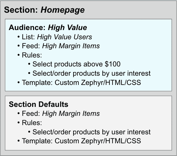 - One or more optional section audiences, to vary the feed, rules, and/or template based on whether the viewer is part of a particular user list. Each audience is assigned a unique list, chosen from the lists in your account. If no audience is matched, default section parameters are used.