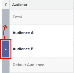 . The audience details are saved and you are returned to the section's management page, where the new audience is listed by the name of its list. - If there are multiple audiences, you can change their order of precedence. (If the user does not match the list in the first audience, the second is checked, and so on.) Audiences' order of precedence is indicated by the numbers in the leftmost column. To change the position of an audience, click and hold its position number and drag it to another position.