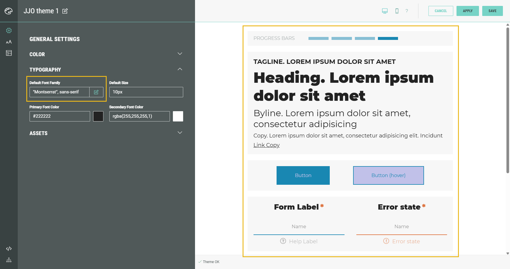 In typography you can set the default font family, default size, primary font color and secondary font color.