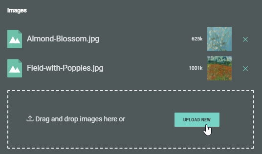 1. Images — You can upload images from your computer through the Upload New button or by dragging and dropping image files into the area.