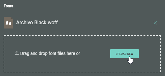 1. Fonts — Custom fonts can be uploaded from your computer through the Upload New button or by dragging and dropping font files into the area.