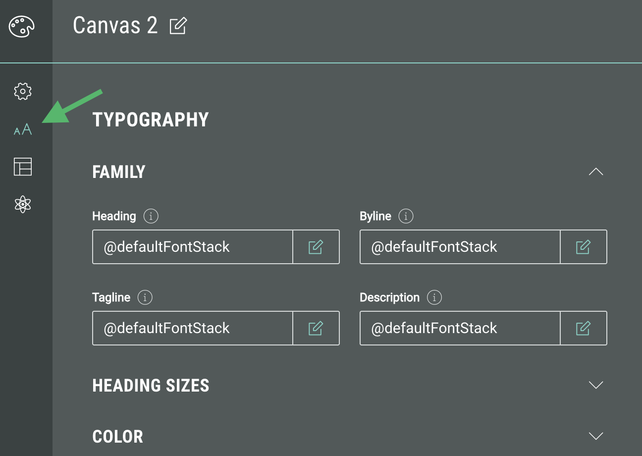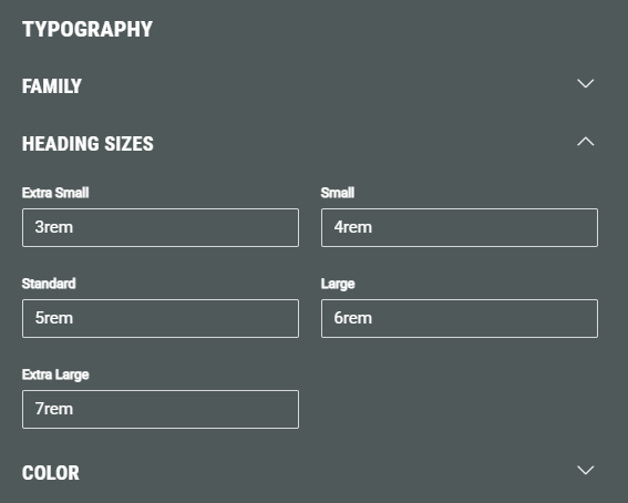 In Typography, the following sections can be seen: Family, Heading Sizes and Color.