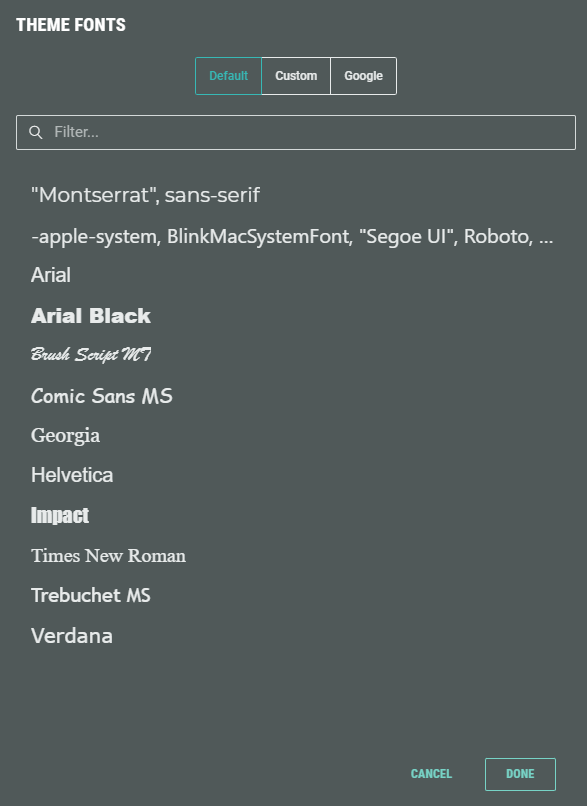 • Custom — Contains custom uploaded fonts. You can upload new fonts here. (*)