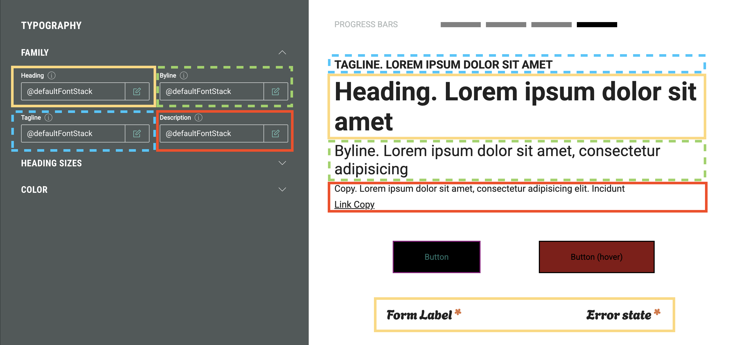 • Heading — Applies to h1, and labels in form and quiz modules.