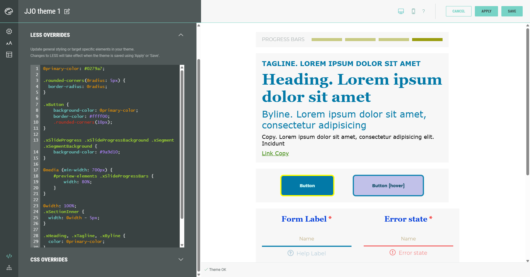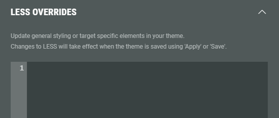 The LESS Overrides section allows you to update general styling or target specific elements in your theme, by manually writing LESS syntax in the field.
