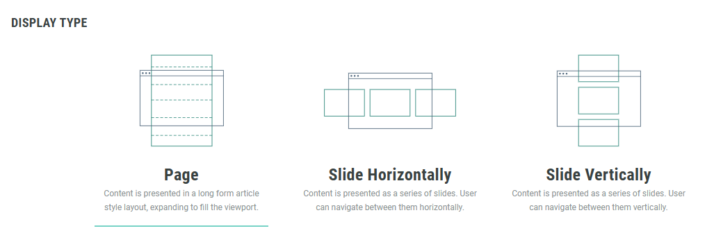 - Display Type — You can set your display layout to be a page, horizontally navigated slides, or vertically navigated slides.