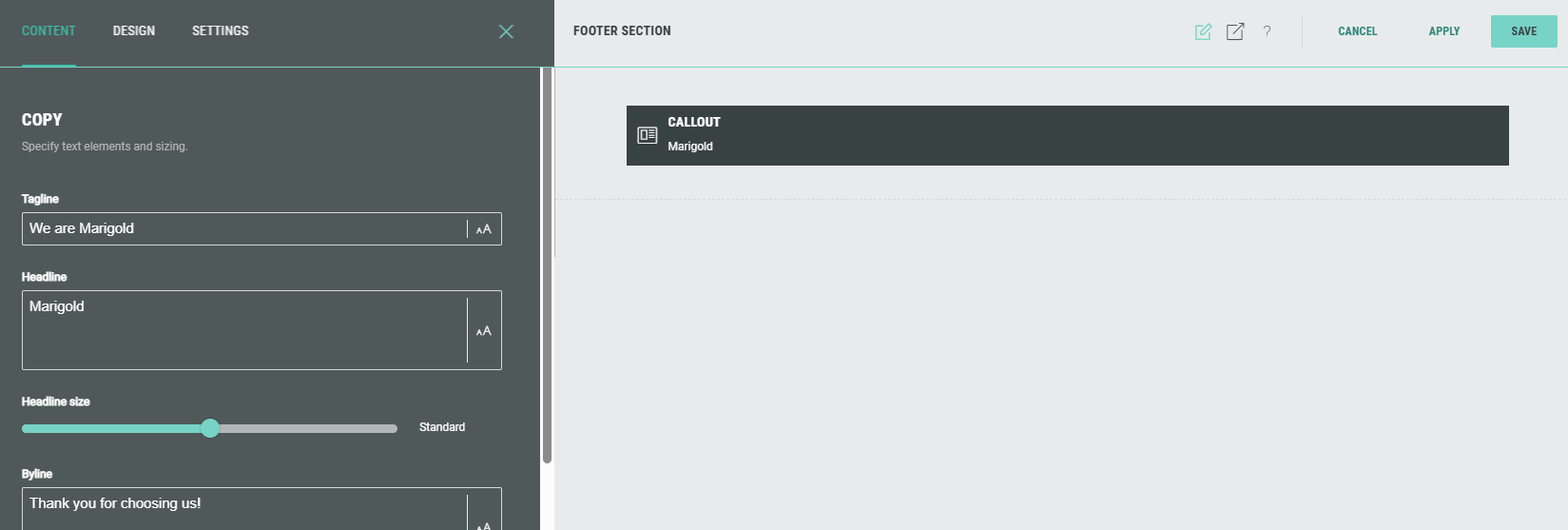 - A footer has been added with a Callout module, containing some footer text.