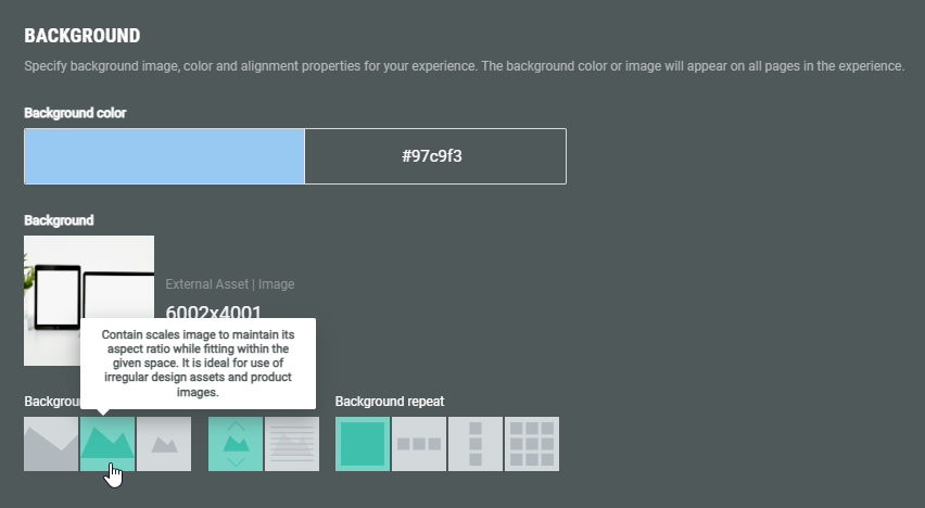 - A background color is set and a background image is selected with display size set to contain, which scales the image while maintaining the aspect ratio. The rest of the page will be filled with the chosen background color.