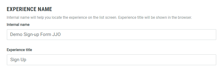 - Experience Name — Set an internal name to help you identify this Experience in the list of all Experiences, and an Experience title that will appear in the browser (page/tab title) when someone accesses the Experience.