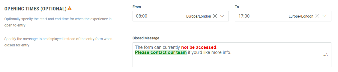 - Opening Times (optional) — You can set the start and end times to control when the Experience is available for entry (for example: only during office hours).