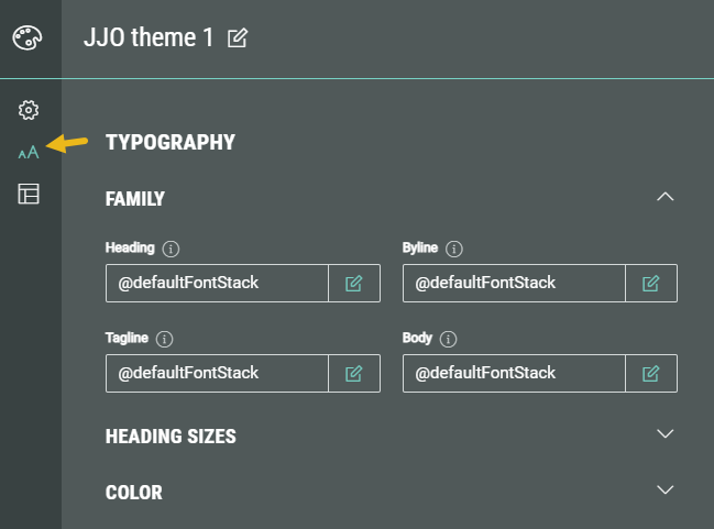 In Typography, the following sections can be seen: Family, Heading Sizes and Color.