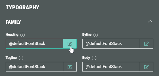 You can see the font family values set by default (inherited by the main theme's settings), which you can edit by manually typing in the field or by clicking on the Pencil icon next to each field.