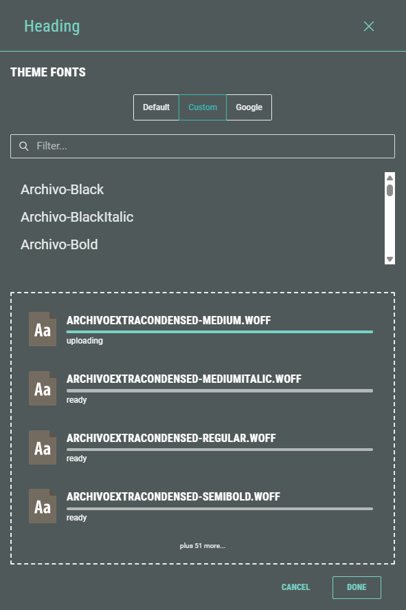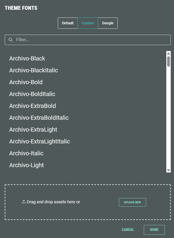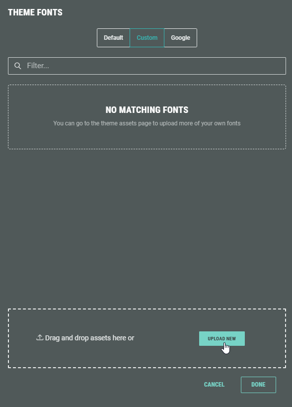 Note: You can also upload new custom fonts in the Assets > Fonts section of the Theme Designer.