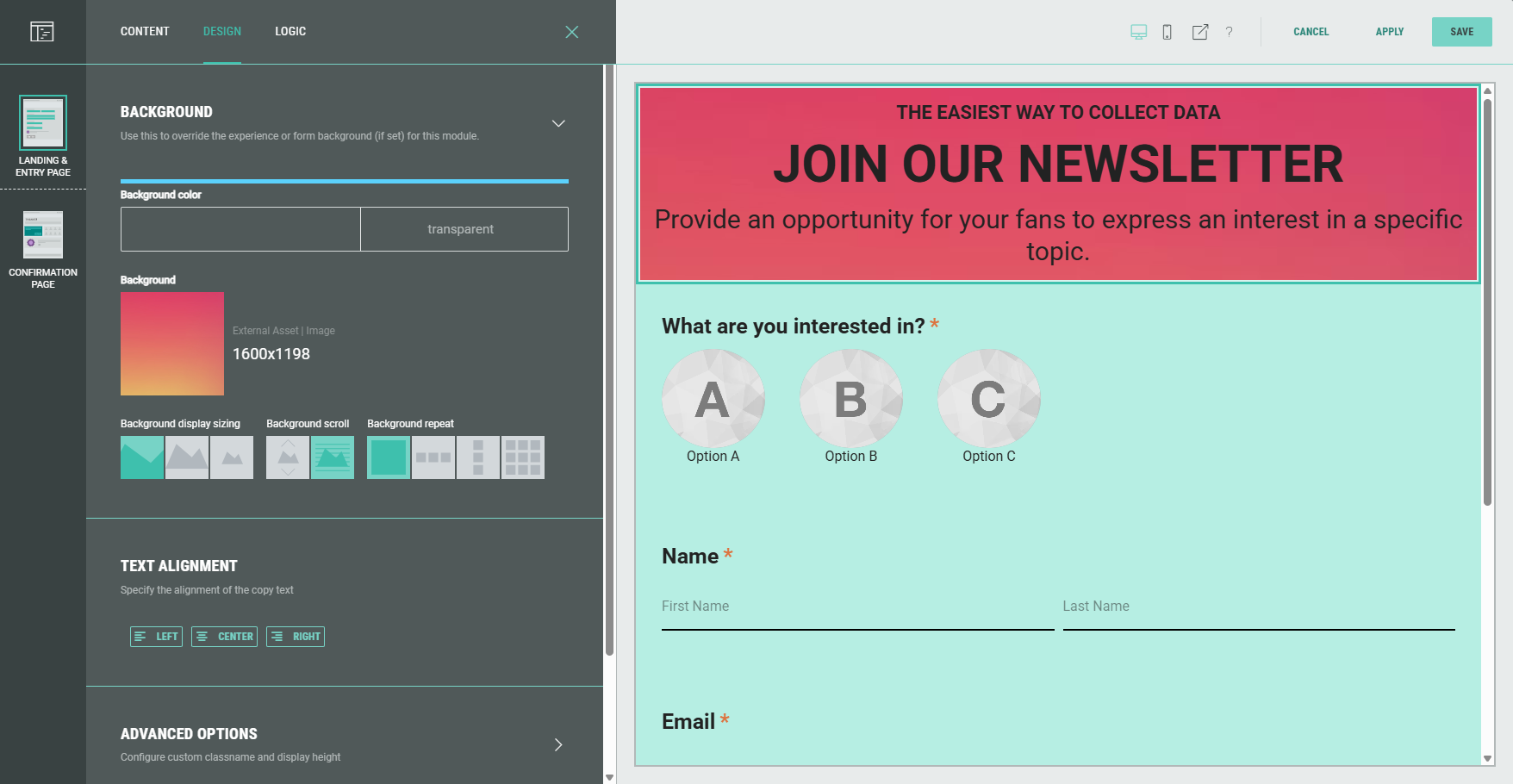 To set a background at form-level, edit the Landing & Entry Page in your Experience and select Form settings in the Form Section.