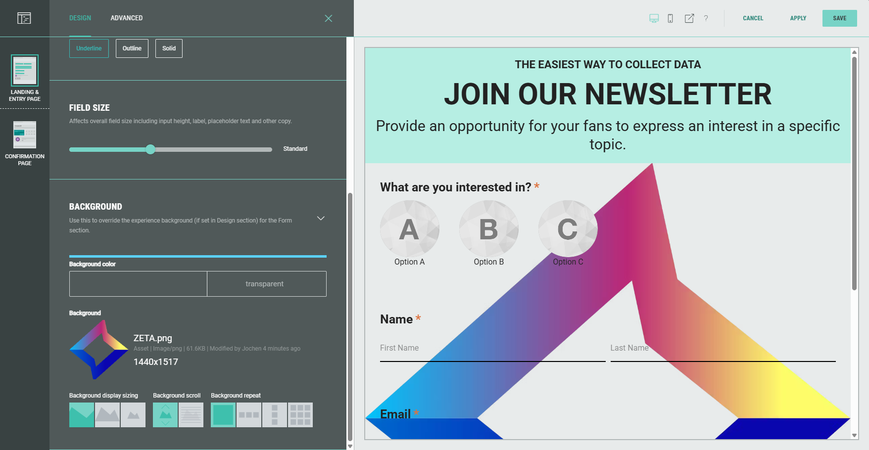 Once uploaded, you can see the background image with its details in the Design settings on the left, and the applied image shown in the background of the Experience preview on the right.