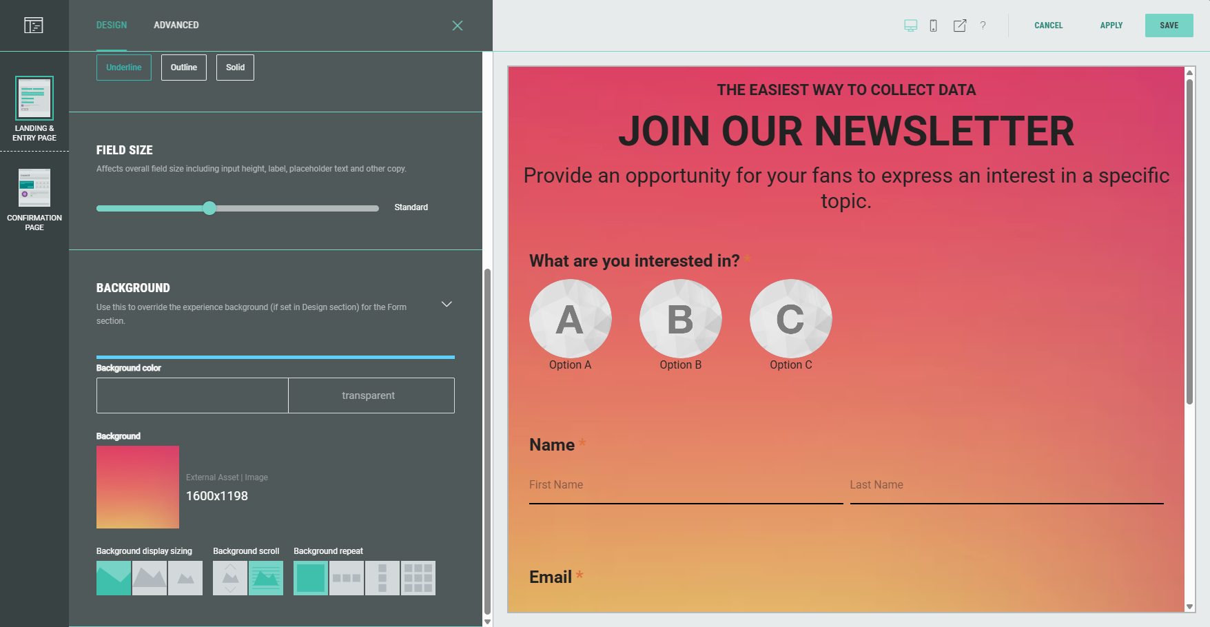 To set a background at form-level, edit the Landing & Entry Page in your Experience and select Form settings in the Form Section.