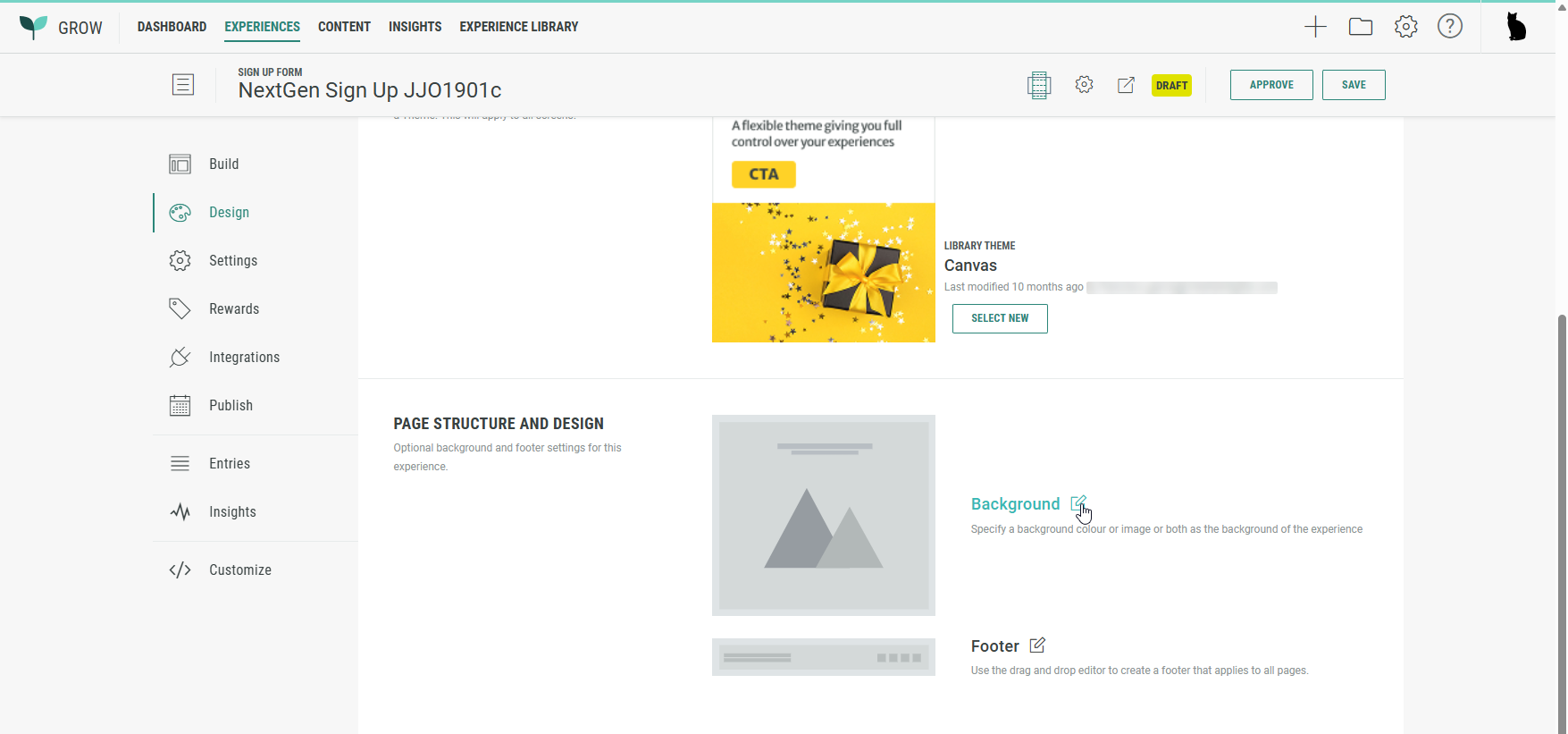 To set a background at Experience-level, from your Experience screen select Design in the left-hand navigation.