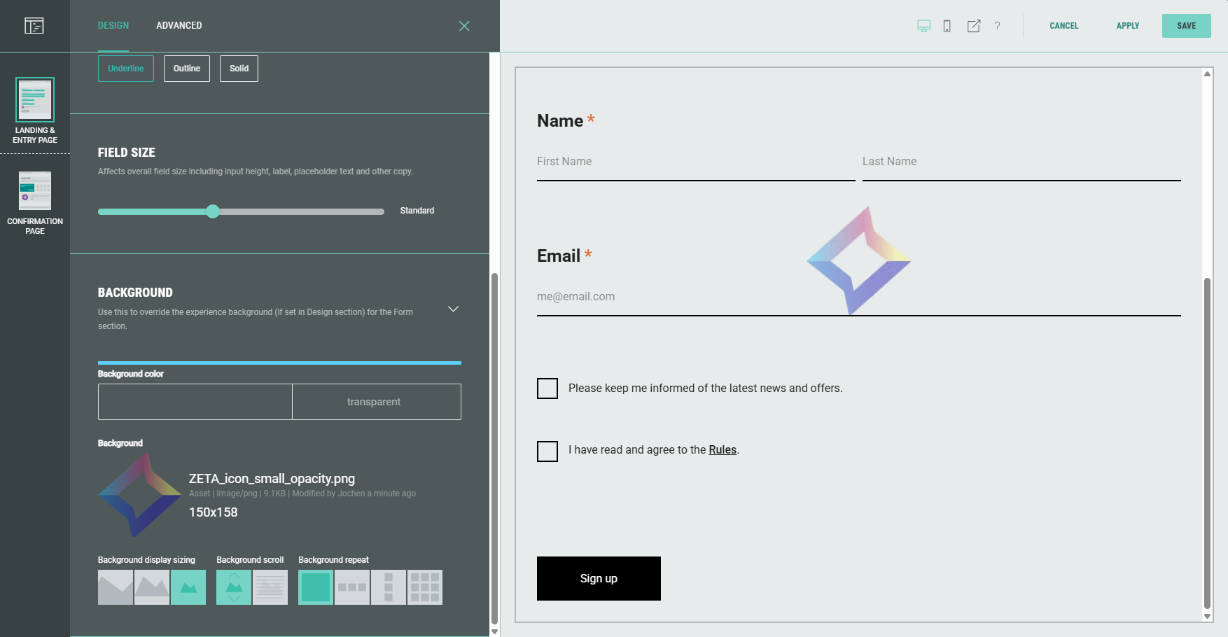 Example: The Zeta icon with dimensions 150x158 is used as a background in Form Section.