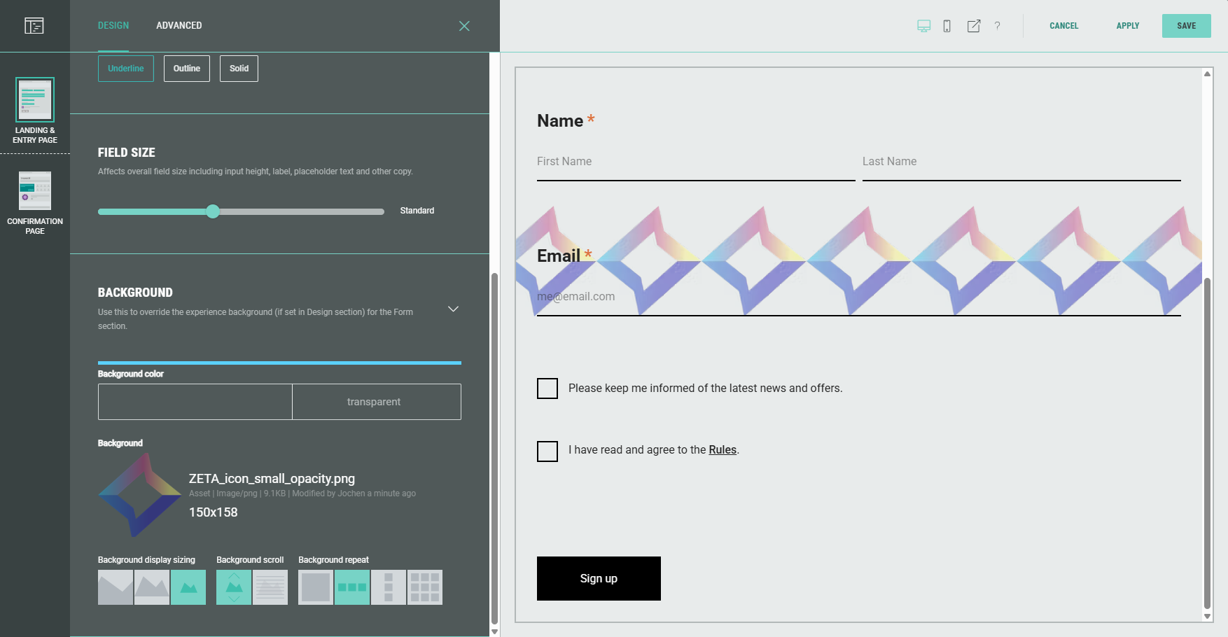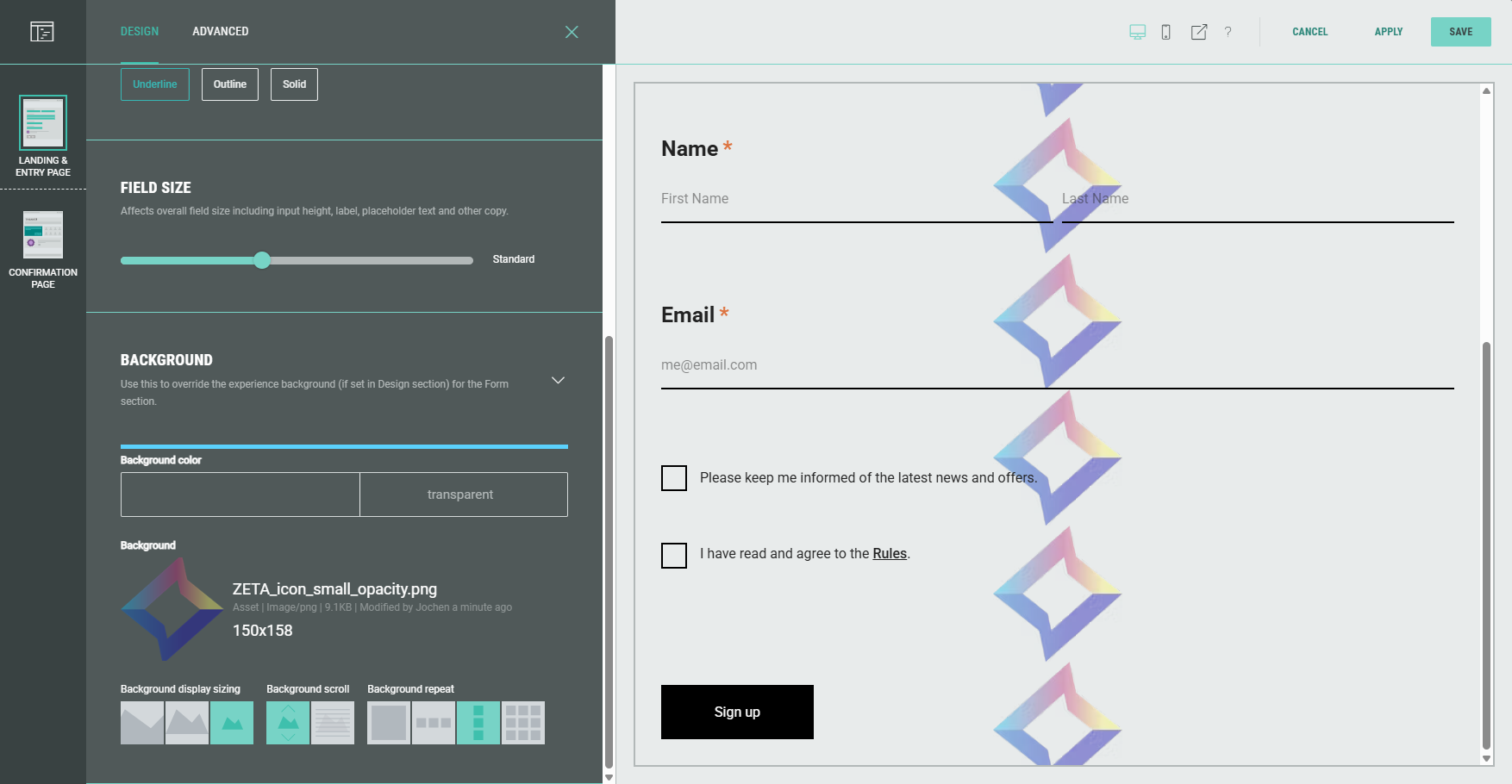 Once uploaded, you can see the background image with its details in the Design settings on the left, and the applied image shown in the background of the Experience preview on the right.