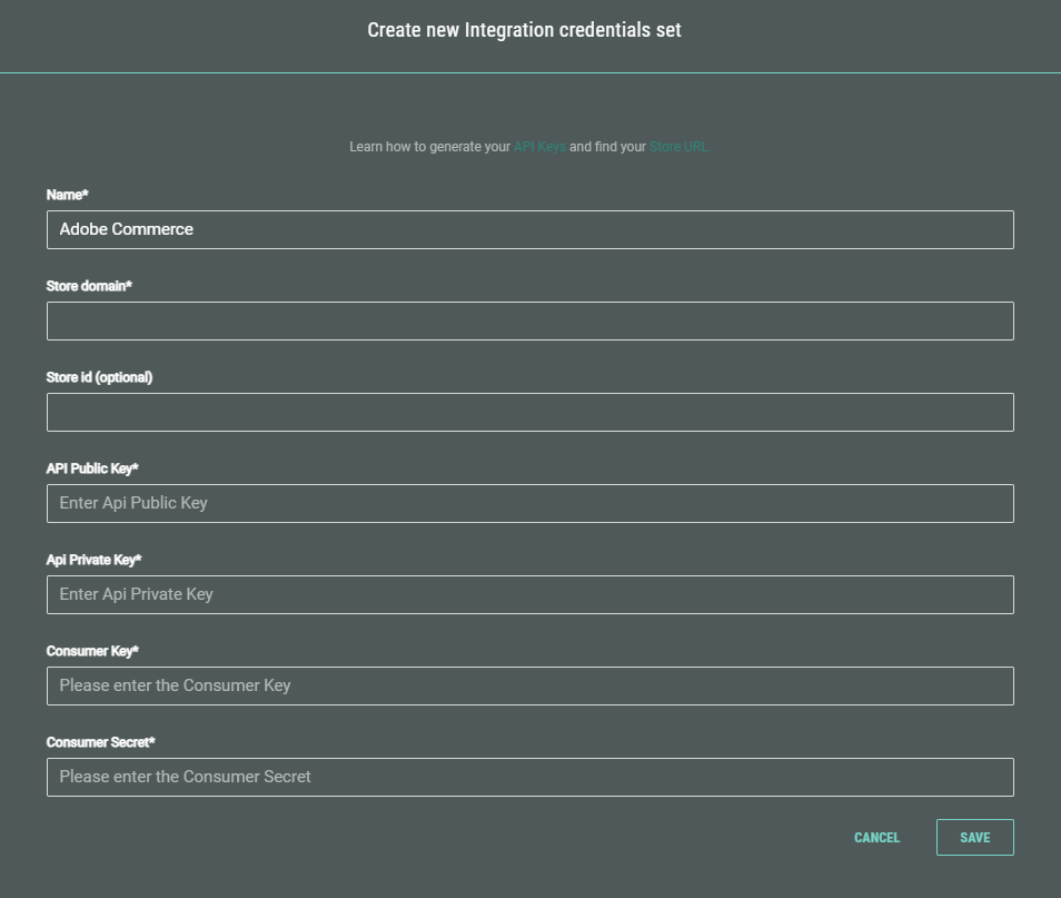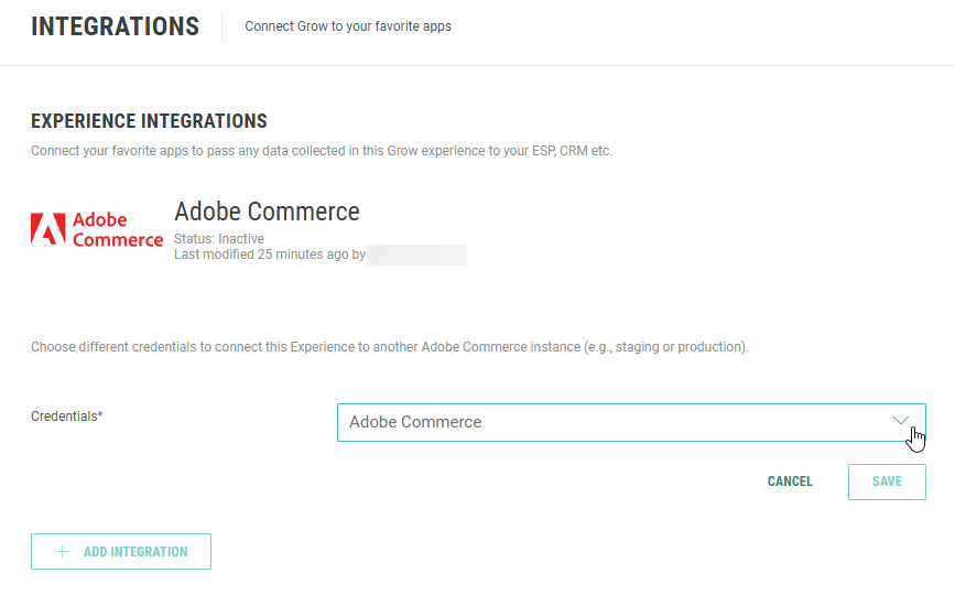 Note: The credentials reflect the Adobe Commerce API keys that are configured in the general Grow Account Integrations section. See this section above to set up an Adobe Commerce API key.