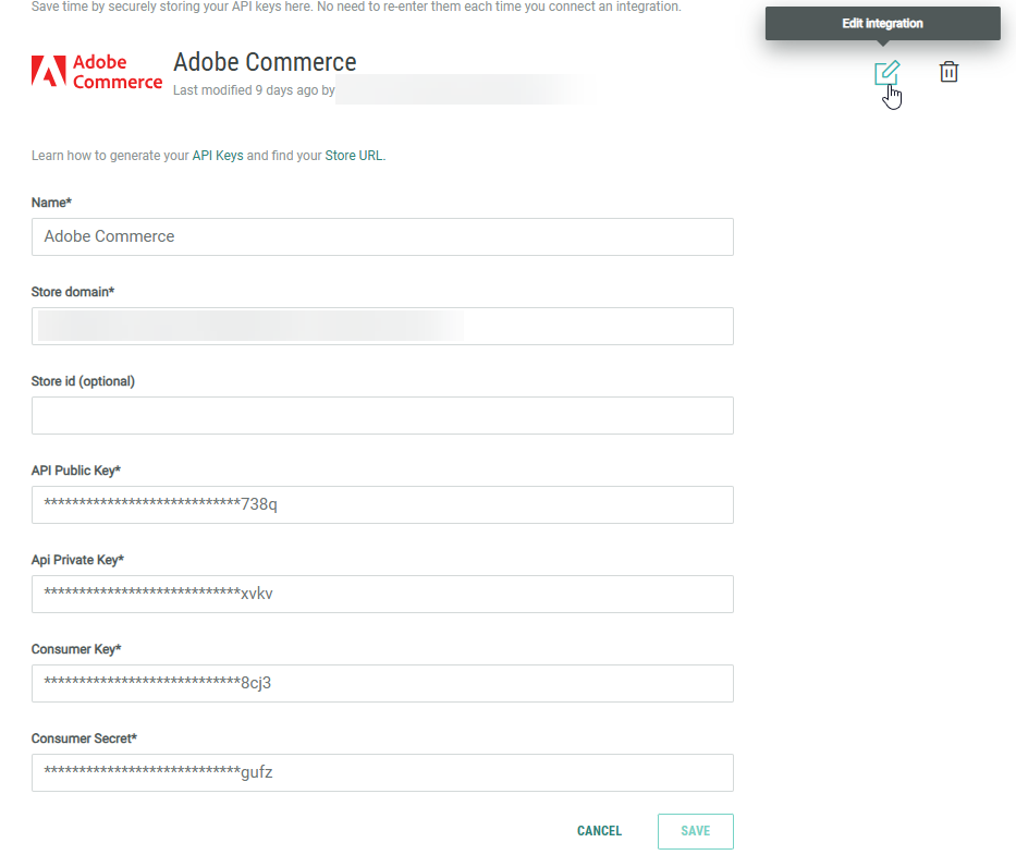Click on the pencil icon on the right to edit the Adobe Commerce integration.