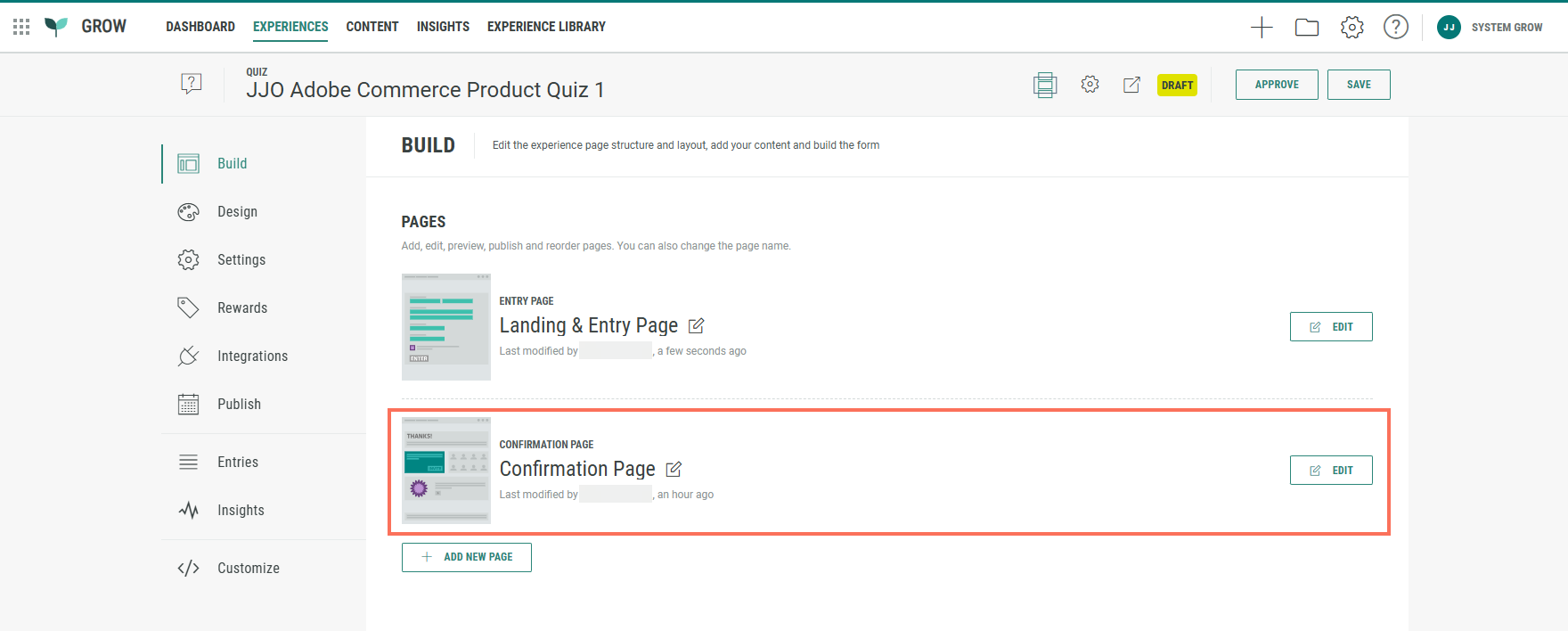 The Build tab offers an overview of the pages included in your Experience. Our Adobe Commerce Product Quiz comes with a Landing & Entry Page and a Confirmation Page.