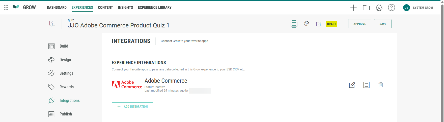 When selecting Integrations from the left-hand side menu, you'll see that an Adobe Commerce integration has been added automatically to your Experience.