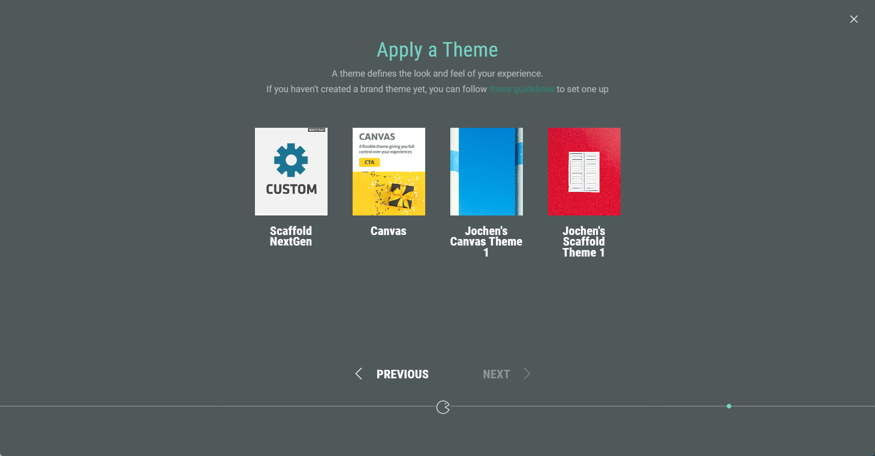 1. Apply a theme. You can select one of your available themes. The theme determines the look and feel of your Experience. Then click Next.