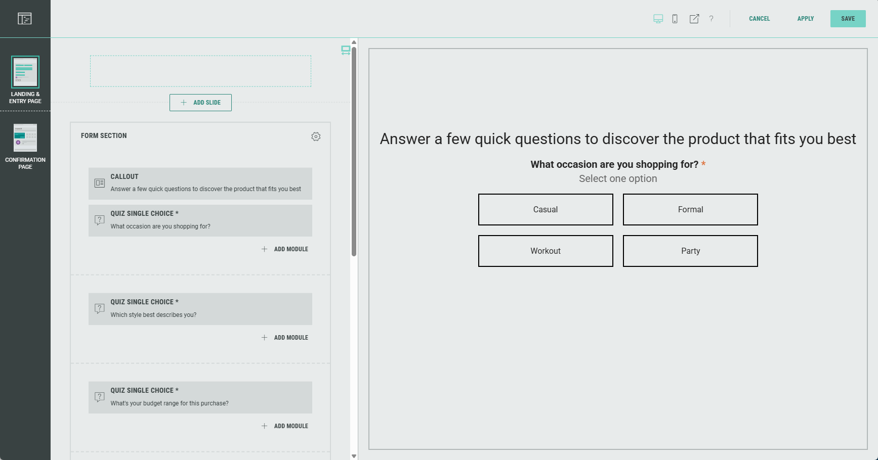 The Landing & Entry Page in the Adobe Commerce Product Quiz by default contains a Form section with four slides.