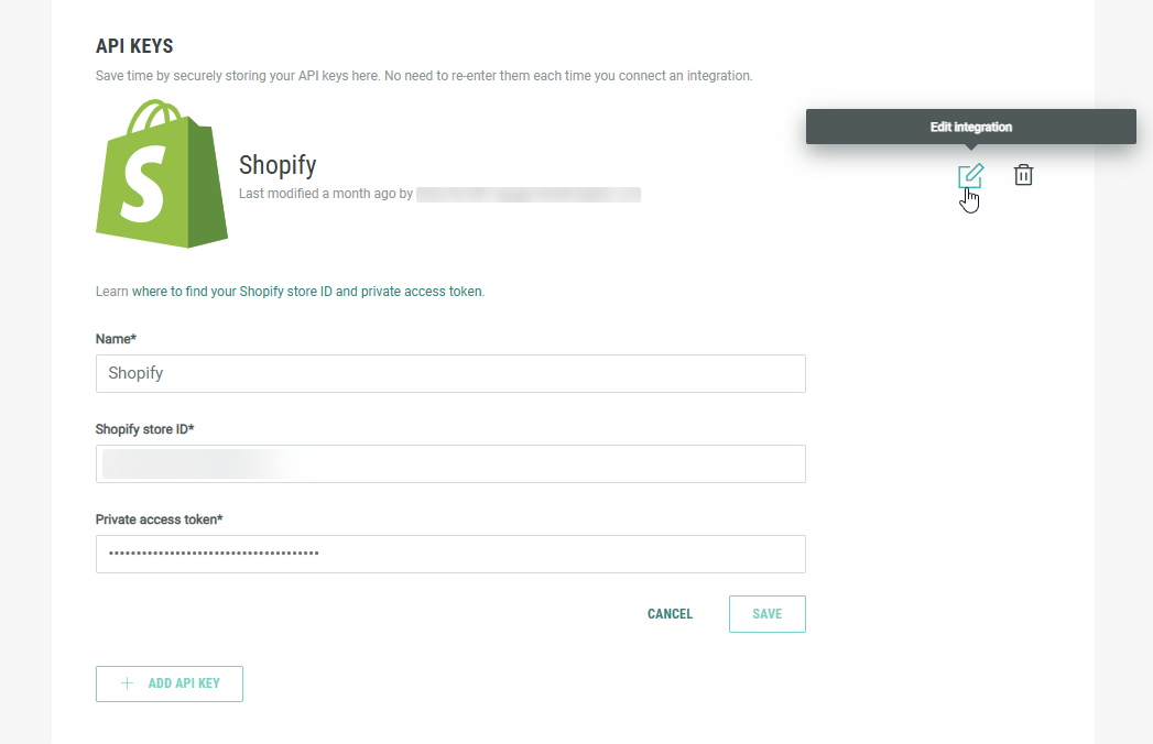 Click on the pencil icon on the right to edit the Shopify integration.