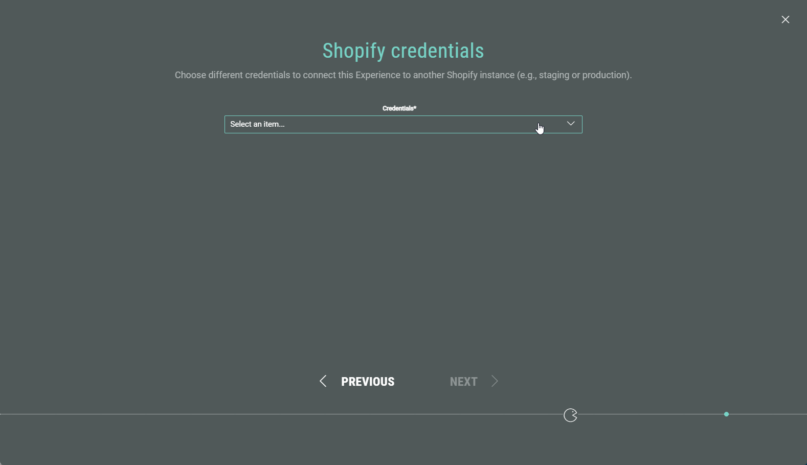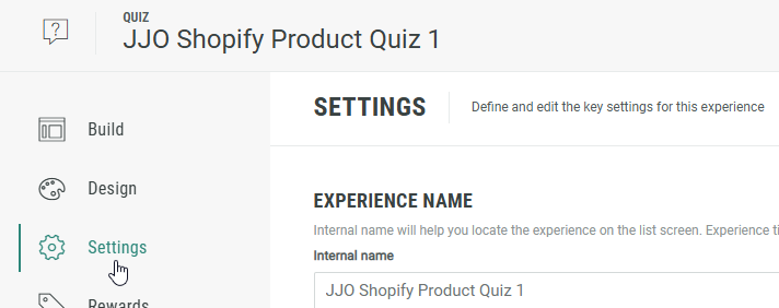 Once you have completed all the steps in the wizard, you land in your Experience area. Here you find several tabs to work through in order to build your Experience, configure the Shopify integration, define the Experience design, and publish your Experience.