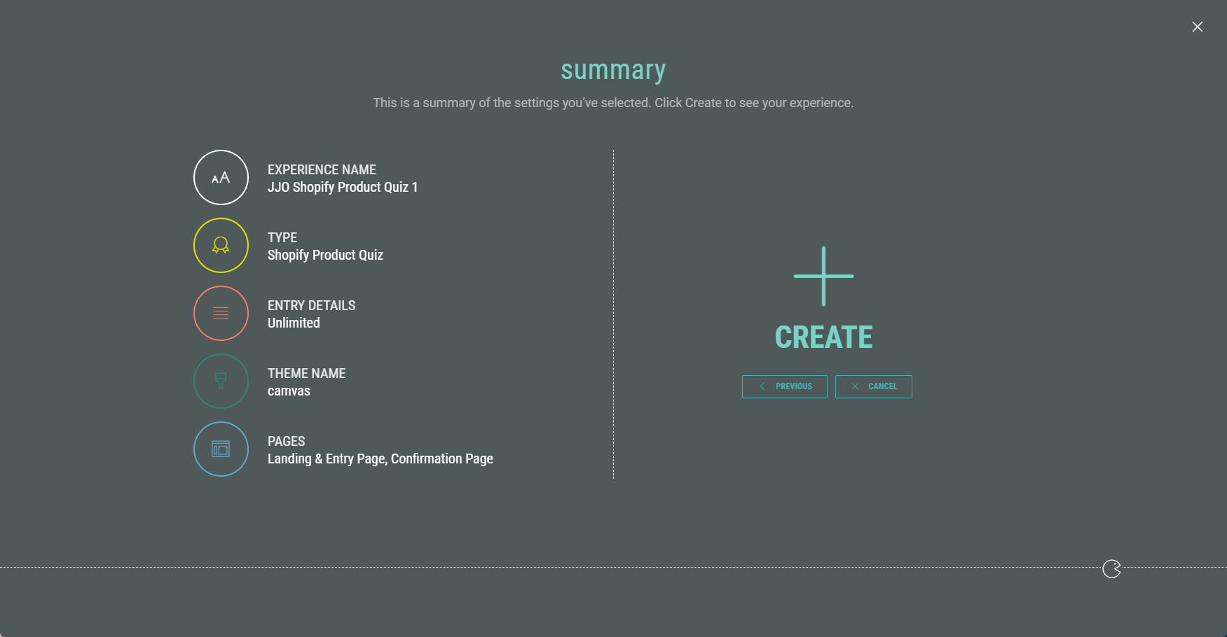 1. Finally, you're presented with an overview of your Experience setup. If you’re happy, click Create to finalize your settings and create the Experience.