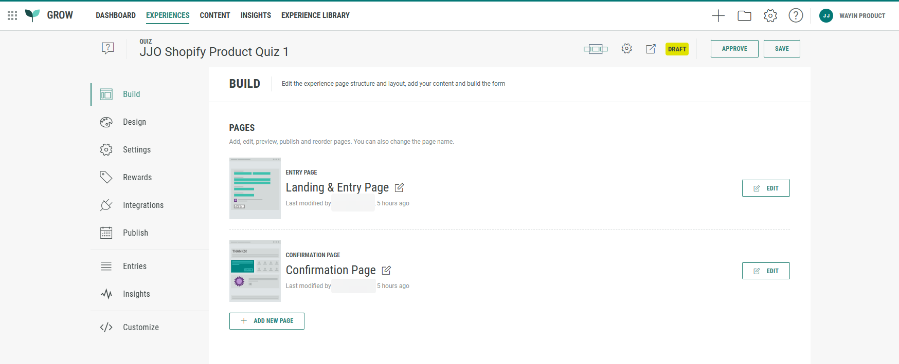 The Build tab offers an overview of the pages included in your Experience. Our Shopify Product Quiz comes with a Landing & Entry Page and a Confirmation Page.