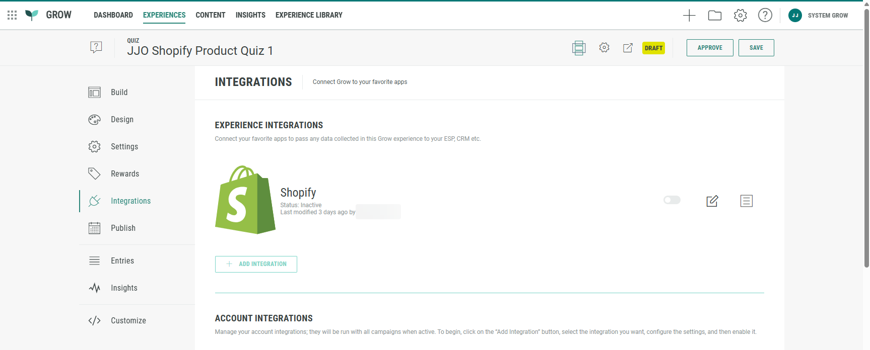 When selecting Integrations from the left-hand side menu, you'll see that a Shopify integration has been added automatically to your Experience.