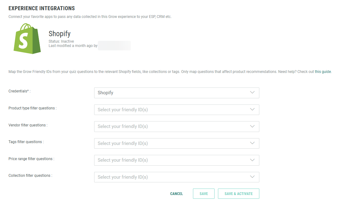 The credentials field at the top is the API key you set up earlier on and used for the integration between your Grow Experience and the Shopify store.