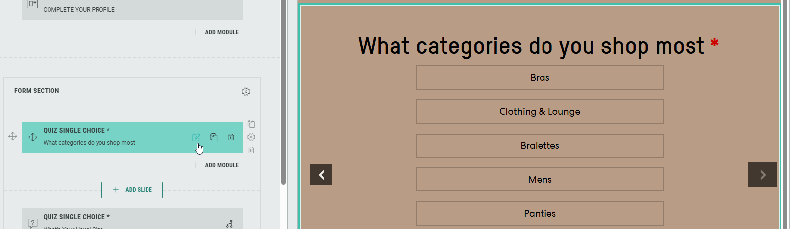 The Landing & Entry Page in the Shopify Product Quiz by default contains a Form section with four slides.