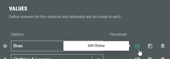 We add the following option labels as answers for that question: Casual, Formal, Workout, Party.