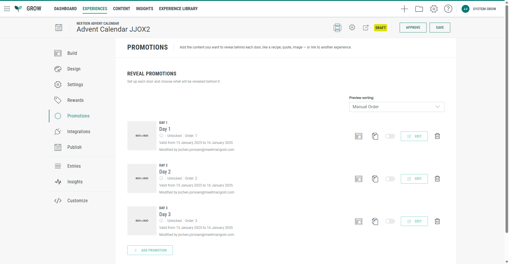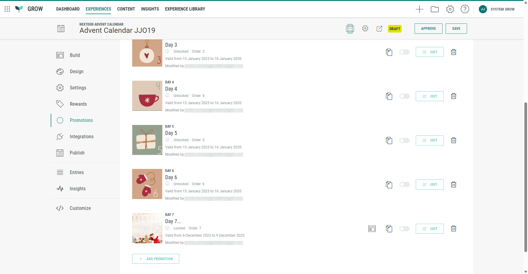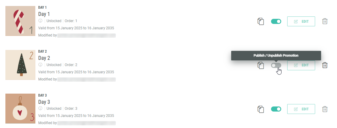 A newly created Advent Calendar Experience contains some preloaded example promotions, which you can tailor to your needs. You can also delete existing ones and add new ones.