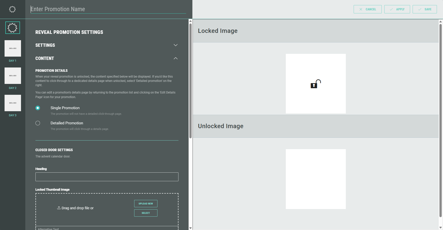 Note: You can always click Apply while configuring the promotion to save your current settings. The setup screen won't close and you can continue working on it.