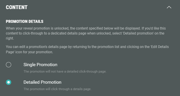 Detailed promotion — The promotion will have a click-through to a dedicated promotions page. This can for example be a form to gather participant data, a quiz you want them to participate in, etc.