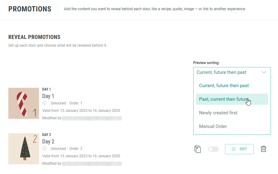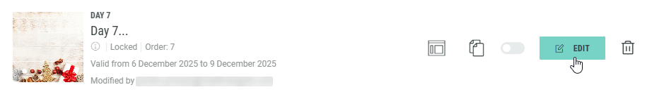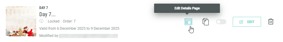 After saving, you return to the Advent Calendar Experience screen where you see all configured Promotions. Your newly added promotion appears on this screen according to the defined sort order.