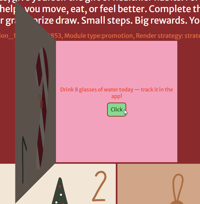 - When the promotion gets clicked (= opened), it will display the content from the opened door.