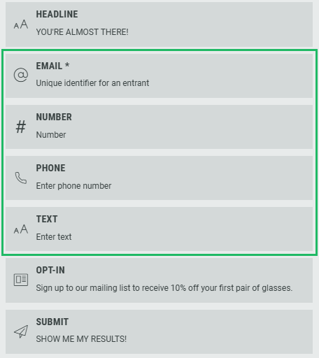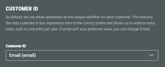 Experiences containing forms collect data from your customers. By default, the Grow platform uses the email address as the unique identifier for each customer. This ensures that the data collected in the Experience links to the correct customer profile, to recognize individual entries and to enforce entry rules (e.g. "Sorry only one entry per user is allowed!").
